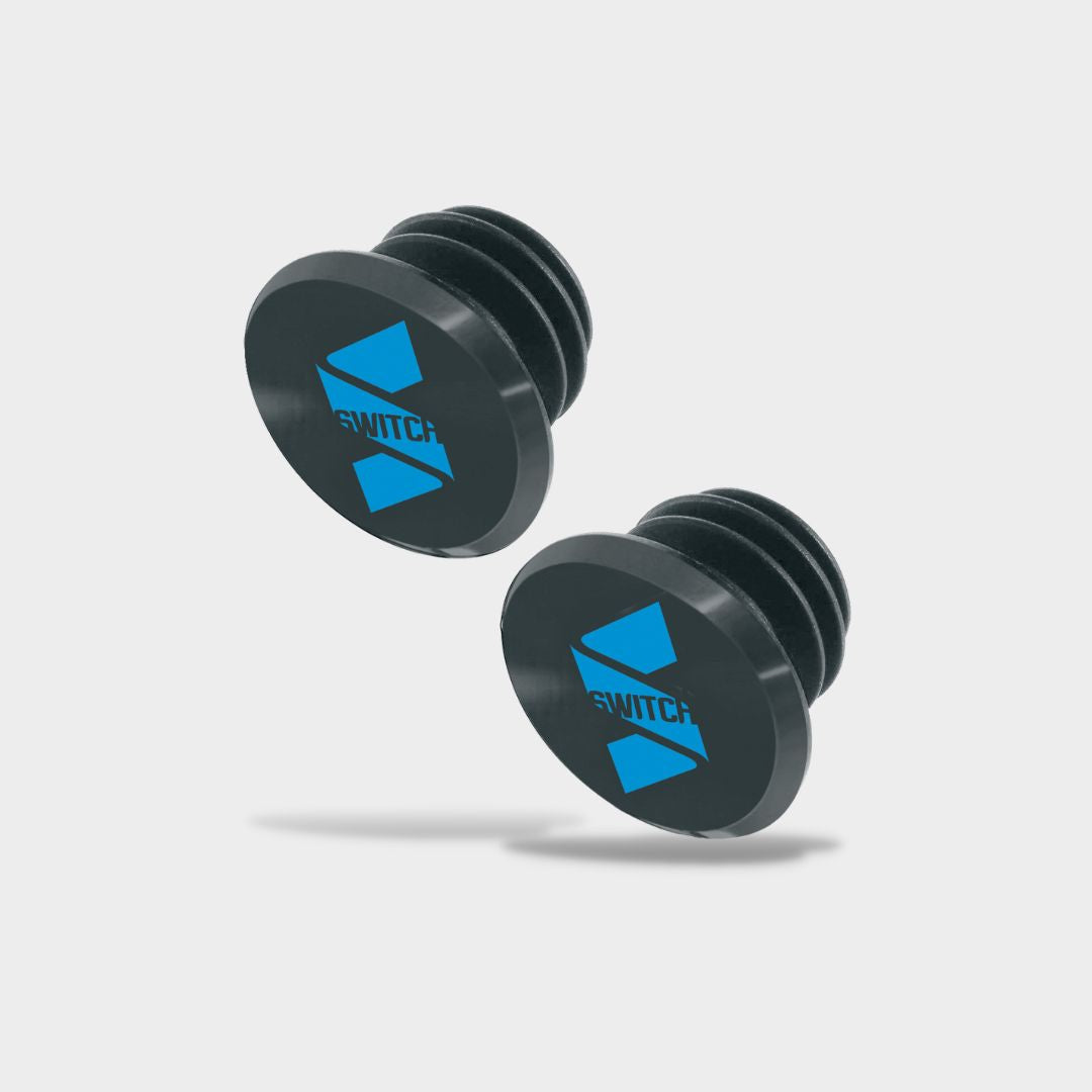 Tappo manubrio realizzato in alluminio CNC con supporto in plastica e logo Switch a contrasto.